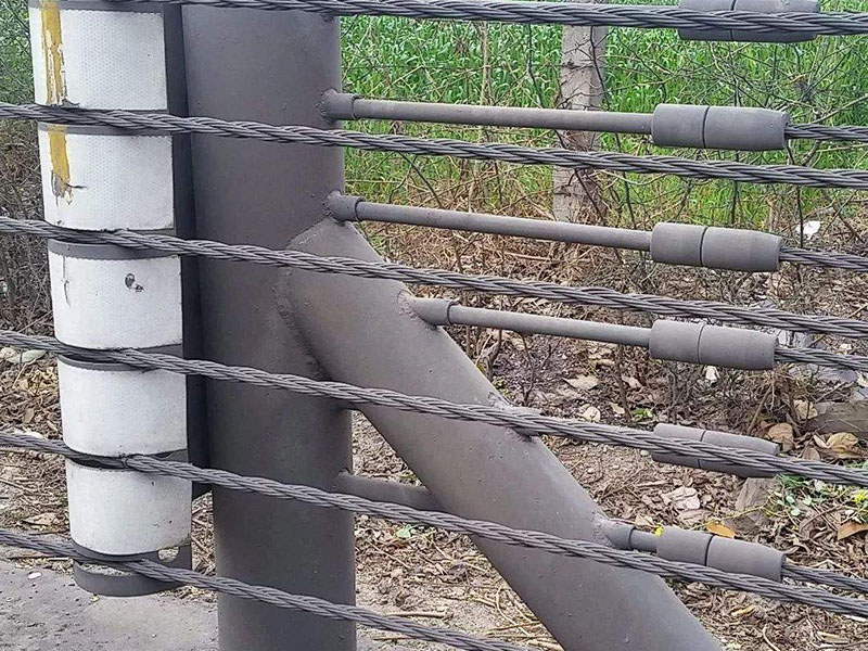 纜索護欄的組成部分:纜索護欄立柱、纜索、纜索護欄中間立柱、托架等。纜索護欄中立立柱主要起到支撐纜索的作用。真正吃力的在纜索護欄兩端立柱,需要將纜索撐緊,這樣才能保證纜索護欄的有效防護。